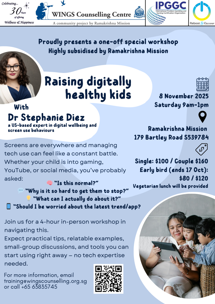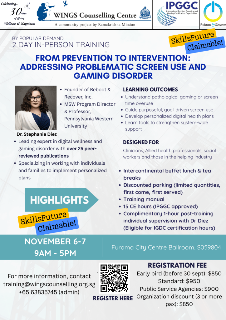 Upcoming Events At Furama RiverFront ballroom6-7 November 2025, 9am-5pmLunch and tea breaks provided At WINGS Counselling Centre, 179 Bartley Road8 November, 9am-1pm.Lunch will be provided. Register Register